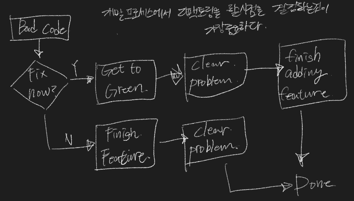 새로운 기능을 추가했는데 이전에 작성한 코드가 예상처럼 동작하지 않는 경우이다. 코드를 작성하는 도중에 동작이 이상하다면 리팩토링을 먼저 진행하고 새로운 기능을 개발해야 한다.