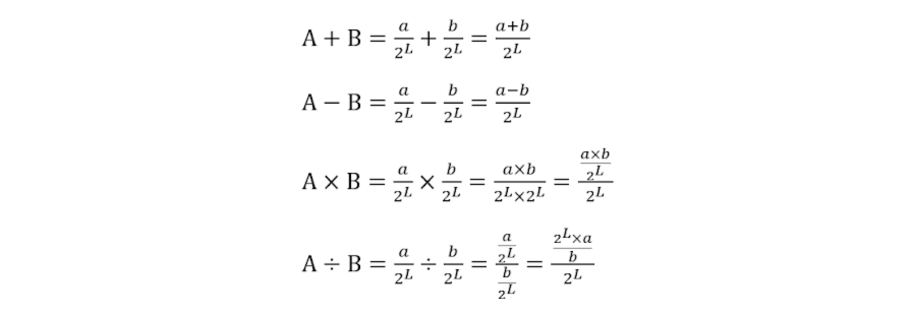 FWL을 L이라고 정하고, 소수점을 찍지 않은 상태의 정수 값을 각각 a, b라고 한다면 다음과 같이 고정 소수점 수를 분수로 나타낼 수 있다.