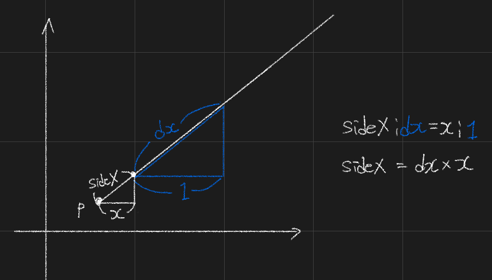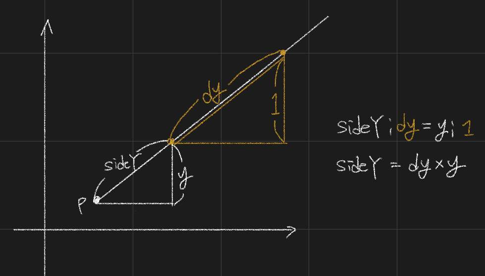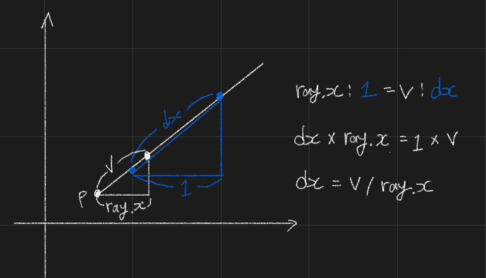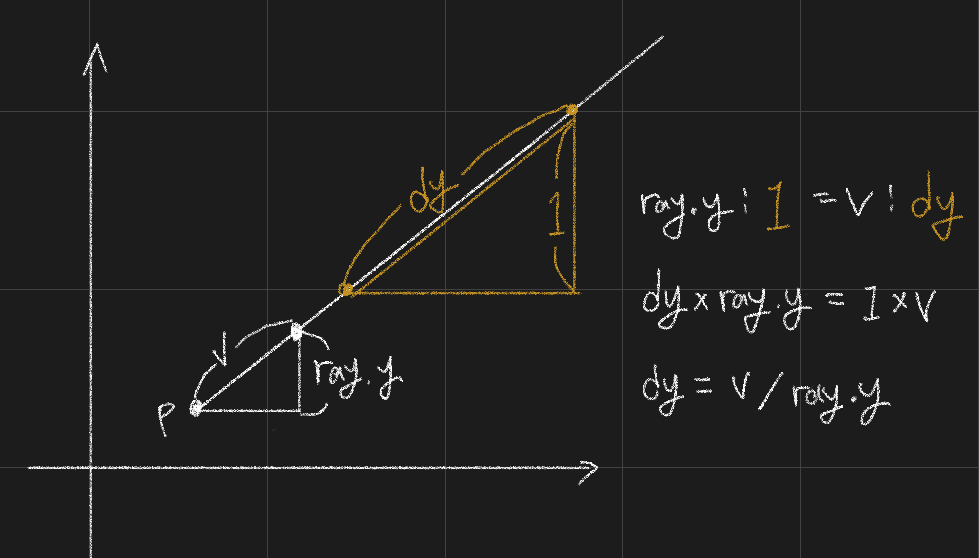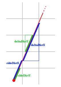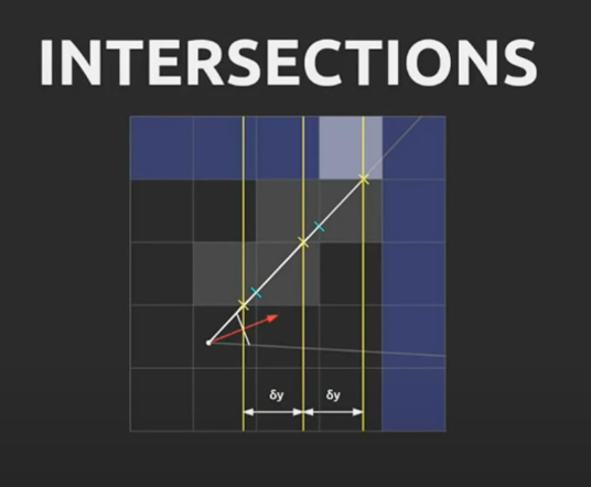 광선이 측면에 도달하면 벽에 적중했는지 확인하는 알고리즘이다. x축과 y축에 광선이 닿을때 확인하는데 현재 닿은 x축과 다음에 닿을 x축의 간격이 그 다음에 닿을 x축까지의 거리와 같으므로 이를 이용한다. 이 간격을 누적하며 벽을 확인한다.