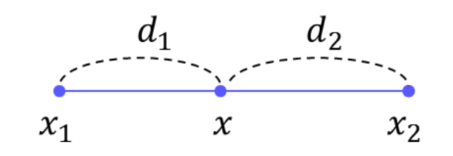 \[f(x) = \frac{d_2}{d_1 + d_2}f(x_1) + \frac{d_1}{d_1 + d_2}f(x_2)\]만약에 거리비의 합이 1이라고 정규화한다면 다음과 같이 단순화될 수 있다.