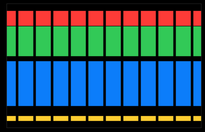 1 2 3 4 5 6 7 8 9 10 11 12 13 14 15 16 17 18 19 20 21 struct GridItemDemo: View { let rows = [ GridItem(.fixed(30), spacing: 1), GridItem(.fixed(60), spacing: 10), GridItem(.fixed(90), spacing: 20), GridItem(.fixed(10), spacing: 50) ] var body: some View { ScrollView(.horizontal) { LazyHGrid(rows: rows, spacing: 5) { ForEach(0...300, id: \.self) { _ in Color.red.frame(width: 30) Color.green.frame(width: 30) Color.blue.frame(width: 30) Color.yellow.frame(width: 30) } } } } }LazyHGrid는 열에서 가장 넓은 셀을 기준으로 각 열의 너비를 설정한다. 주어진 열의 모든 View에 한 번에 접근할 수 있기 때문에 이 작업을 수행할 수 있다. 위의 예에서 Color View는 항상 동일한 고정 너비를 가지므로 전체 그리드에서 열 너비가 균일하다.
