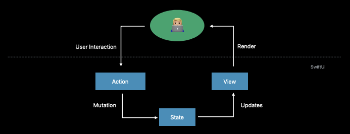 결국 프레임워크가 의존성을 관리해주는 SwiftUI에서는 State만 변경하면 된다. 그래서 이는 다음과 같이 이해하기 쉬운 단방향 데이터 흐름으로 나타난다.